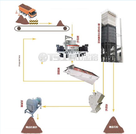 物料首先從原料倉經(jīng)過電子秤進(jìn)入到皮帶輸送機(jī)中,再由提升機(jī)將物料入到制砂機(jī)內(nèi)進(jìn)行破碎處理,破碎后的物料進(jìn)入高頻篩中進(jìn)行篩分,篩分后的較大物料會(huì)返回制砂機(jī)內(nèi)進(jìn)行二次破碎,符合要求的砂子則會(huì)進(jìn)入選粉機(jī)中進(jìn)行選粉處理,產(chǎn)生的粉塵會(huì)經(jīng)由粗細(xì)粉分離機(jī)進(jìn)入到布袋收塵器。最后,篩分選粉合格的產(chǎn)品會(huì)進(jìn)入加濕拌合機(jī)進(jìn)行加水處理,防止機(jī)制砂在運(yùn)輸過程中產(chǎn)生離析或揚(yáng)塵。